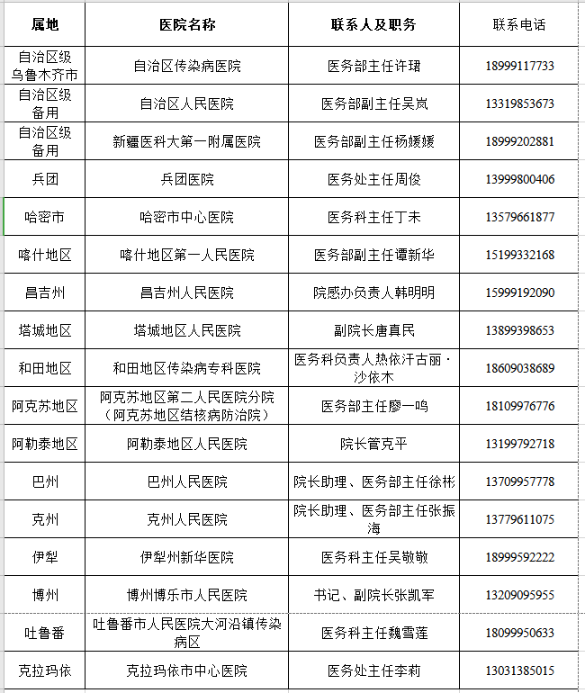 全疆新型冠狀病毒感染的肺炎定點救治醫院名單: