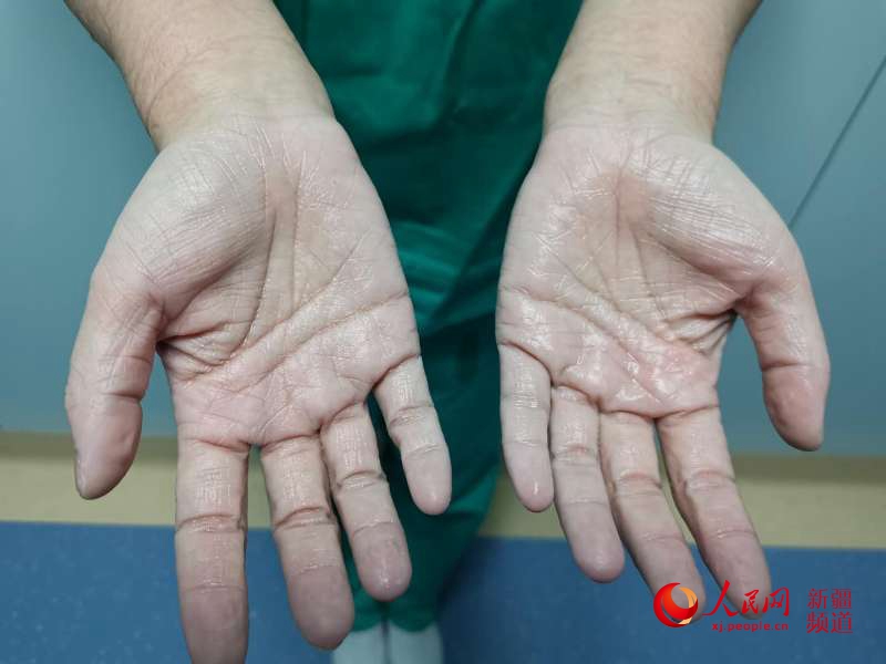 脫下手套的手讓人心疼。