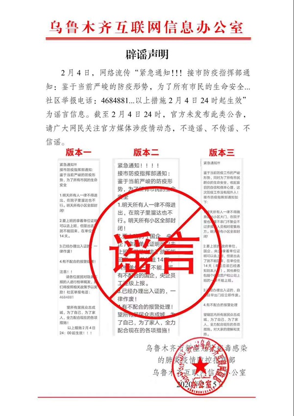 人民網烏魯木齊2月5日電 2月4日,網絡流傳“緊急通知。!接市防疫指揮部通知:鑒于當前嚴峻的防疫形勢,為了所有市民的生命安全...社區舉報電話4684881...以上措施2月4日24時起生效”為謠言信息。截至2月4日24時,官方未發布此類公告,請廣大網民關注官方媒體涉疫情動態,不造謠、不信謠、不傳謠。