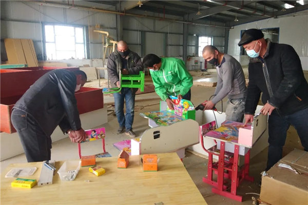 走進阿熱買里村木材加工車間,工人們正在有條不紊地組裝課桌椅,院子里擺滿了加工好的桌椅,正在等待送貨。接到復工的通知后,車間負責人艾克帕爾·熱依木在工作隊的指導幫助下,及時組織工人投入生產,加工車間指定專人做好員工體溫測量、登記、消毒等工作,做到防疫和生產兩不誤。