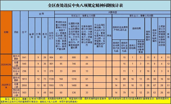 2020年3月,全疆查處違反中央八項規定精神問題841起,處理940人,其中黨紀政務處分296人。受黨紀政務處分的干部中,地廳級6人、縣處級11人、鄉科級及以下279人。