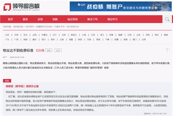 4月28日,一名網友向烏魯木齊高新區(新市區)委書記留言稱,鯉魚山南路魯達國際小區,物業更換很多次,物業的質量達不到,收費太高是四類收費標準,小區地下室電梯外沒有監控攝像頭存在消防隱患。地下停車收費太高,小區清潔人員大部分都已收廢品為主才能生活(工作人員工資太低),希望所管轄部門好好管理。