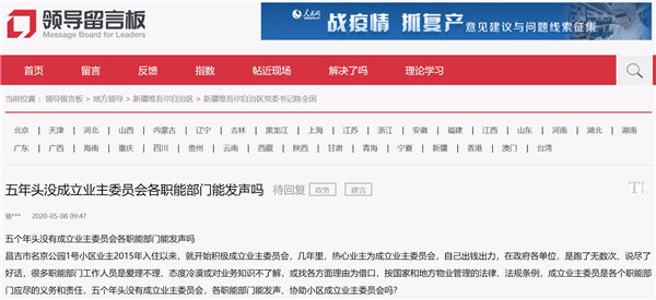 5月8日,一名網友向自治區黨委書記留言稱,昌吉市名京公園1號小區自2015年入住以來,就開始籌備成立業主委員會,幾年里,為成立業主委員會出錢出力,跑了無數次政府部門,說盡了好話,很多工作人員愛搭不理、態度冷漠或對業務知識不了解,找各種理由。按國家和地方物業管理的法律、法規條例,成立業主委員是各個職能部門應盡的義務和責任,五個年頭沒有成立業主委員會,各職能部門能發聲、協助小區成立業主委員會嗎?