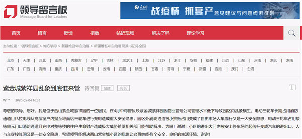 5月4日,一名網友也向自治區黨委書記留言,稱西山紫金城紫祥園物業管理公司管理水平低下導致園區內亂象橫生,電動三輪車長期占用消防通道且私拉電線從高層窗戶內拋至地面給三輪車進行充電造成重大安全隱患,園區外消防通道被小推販占用變成了自由市場人車混行又是一大安全隱患,電動三輪車占用摟棟單元門口消防通道且充電對整棟樓的住戶生命財產造成極大威脅。小區的進出大門也被安上停車場的起落桿變成汽車的進出口,人與車穿梭其間又是一處安全隱患,希望領導能解決西山紫金城小區的亂象讓老百姓能有個安全、良好的生活環境。