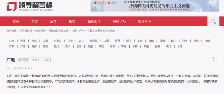 家住烏魯木齊市天山區和平南路一巷的網友留言稱,從6月12日至今家里無網無信號無電視,多次致電廣電,但是恢復時間一直在推脫。