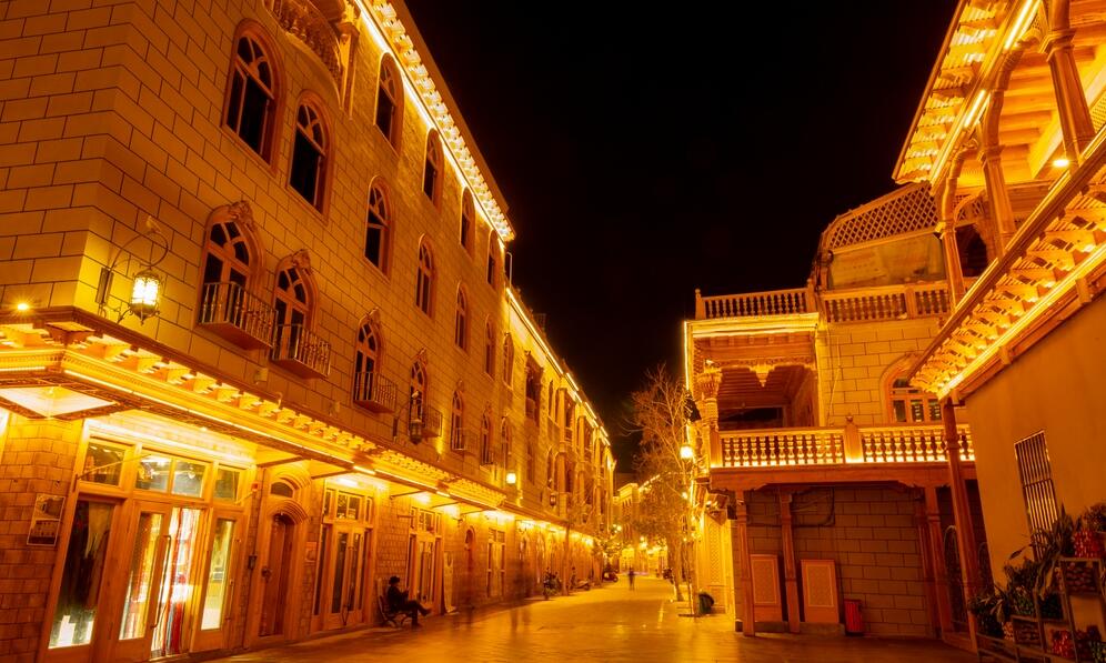 在團城街區還,艾德萊斯綢、地毯、傳統手工藝品、和田玉等民族文化特色的小店不少,當然,肯定少不了和田當地特色美食。