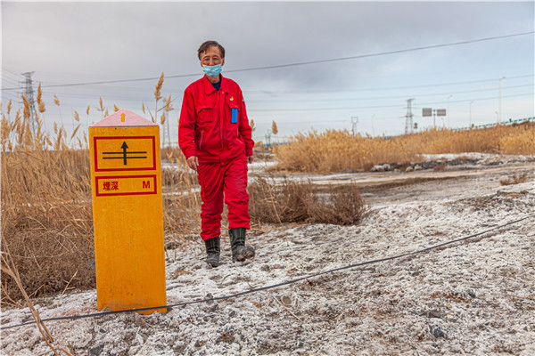 3月24日,油氣儲運公司交油隊巡線工譚偉民徒步巡查紅淺原油管道。張克文攝