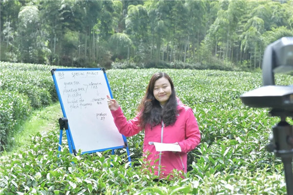 2020年3月31日,焦魯溢走進西湖龍井茶園通過“空中絲路課堂”為萬里外的阿克蘇學生授課。
