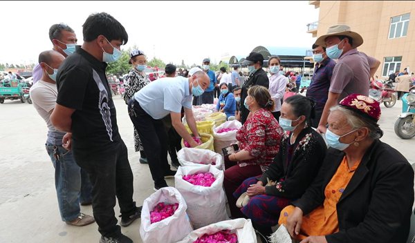和田市伊里其鄉黨委副書記、鄉長吐爾洪·吾不力艾山說:“通過我們和當地知名的幾家企業對接了以后,這幾家企業主動擔當作為,第一時間和農民對接把玫瑰花收購了,而且高于市場價格一倍多,保障花農的利益!