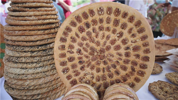 展臺上核桃馕、玫瑰花馕、辣皮子馕、奶油馕等多種風味的馕吸引了不少市民前來品嘗,大家都贊不絕口。
