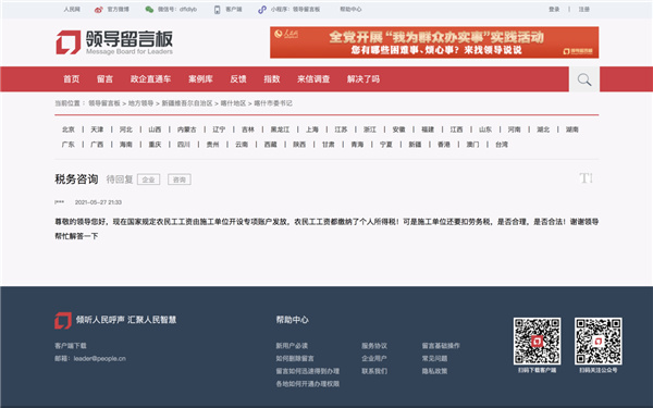 人民網烏魯木齊6月5日電 (楊睿)“農民工工資都已經繳納了個人所得稅,施工單位還要扣勞務稅,是否合理合法?”近日,一位網友在人民網《領導留言板》新疆板塊給新疆喀什市委書記留言說道。