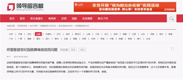 “近期,呼圖壁縣世紀園跳舞噪聲嚴重擾民,影響到廣域花園小區里孩子們正常的學習和休息,前期已經向縣防疫指揮部、縣110指揮中心、縣城鎮派出所、世紀園管理處等單位反映過問題,但并未徹底解決,中高考即將來臨,懇請領導能以孩子們的未來為重,盡快解決噪聲擾民問題,還孩子們一個安靜的學習環境!