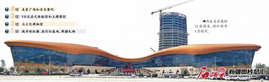 新疆游客集散中心分東區和西區,目前試運營的東區共4層樓,1樓為城市候機樓、旅行社基地、新疆禮物;2樓為玉文化博物館;3樓為VR沉浸式體驗館和主題餐飲;4樓為美食廣場和音樂餐吧。西區為在建的22層酒店,預計明年5月投用。