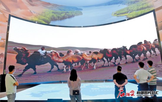 9月1日,游客在新疆游客集散中心1樓觀看新疆旅游推介短片。韓亮攝