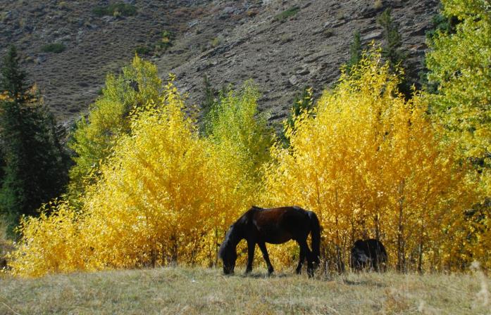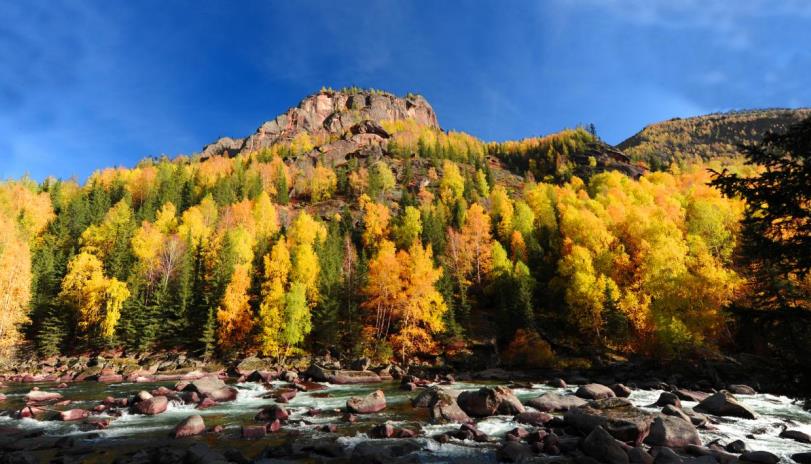 9月的可可托海,如一幅濃墨重彩的油畫,金黃色的白樺林為主色調,綠色、紅色、橙色等顏色的樹木、灌木和果實點綴其中,額爾齊斯河穿流而過,又添了一份動感。此外,目前正是轉場的季節,游客還可以觀看到轉場的壯觀場景。