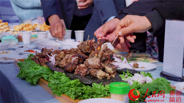 游客正在品嘗“阿勒泰十大名吃”之一的石板烤肉。人民網 李欣洋攝