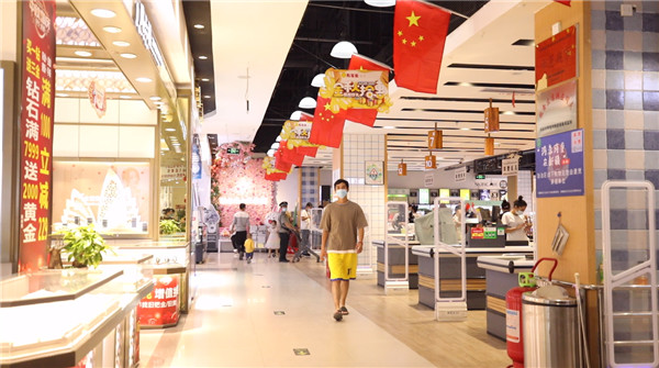 在和田市建設西路,筆者看到沿街的商鋪都自發懸掛起了五星紅旗,店內各類裝飾也是以“中國紅”為主基調,放眼望去火紅一片,給人強烈的視覺震撼。除了沿街商鋪外,和田各大商超也自發在店內掛起小國旗,營造出濃厚的節日氛圍。