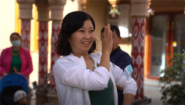 烏魯木齊游客安麗君與當地居民一起跳麥西來甫。