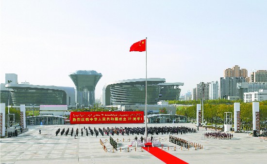 10月1日,新疆維吾爾自治區在新疆國際會展中心隆重舉行升國旗儀式,熱烈慶祝中華人民共和國成立72周年。崔志堅攝