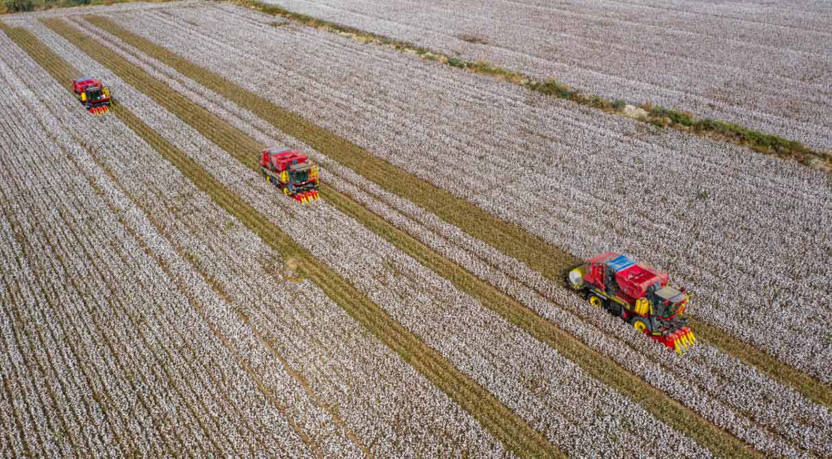 “地里都是機器在勞作,一兩個人就夠了。家里騰出人手搞養殖,雙份收入讓我們的生活越過越滋潤!薄敖衲昝藁▋r格好,肯定比去年收入還要高!薄拔覀兌际亲栽竵磉@里工作,沒有人強迫我們,我過得非常幸福,新疆的棉花非常好!薄R頭所及片片棉田春華秋實,機器打包的棉包整齊堆放,棉農們的笑容發自內心。通過視頻,喀什地區、和田地區、阿克蘇地區、昌吉回族自治州、克拉瑪依等地的棉農幸福生活景象被真實展現。