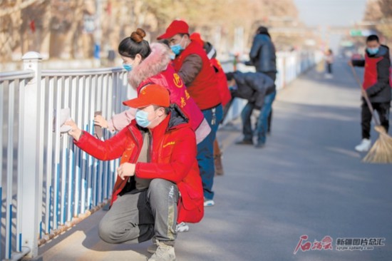 12月4日,洛浦縣氣象局志愿服務隊隊員在城區擦拭道路交通護欄。12月5日是國際志愿者日。連日來,洛浦縣組織開展了送平安、送法律、送政策、送健康、送溫暖等志愿服務活動。 買買提艾力·艾尼瓦爾攝
