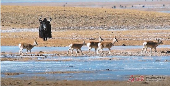 12月12日,野牦牛和藏原羚在阿爾金山國家級自然保護區內的依協克帕提湖邊飲水。尚鵬攝