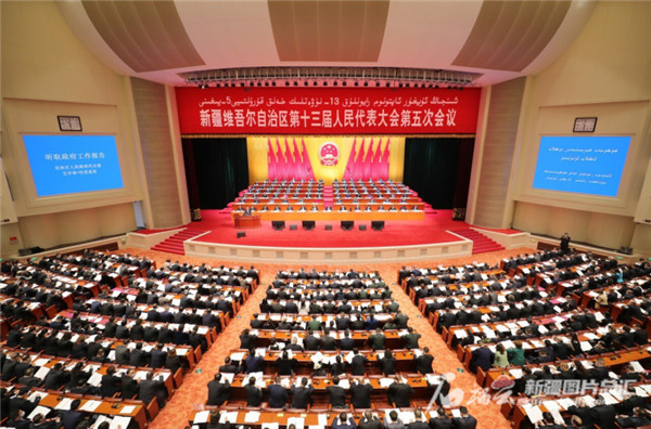 上午10時,開幕會主持人肖開提·依明宣布:新疆維吾爾自治區第十三屆人民代表大會第五次會議開幕。全體起立,高唱國歌。