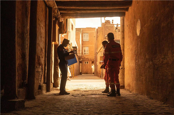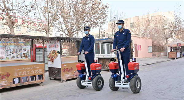 喀什市古城消防救援站消防救援人員與喀什古城應急救援隊隊員共同開展消防安全巡查。聶寧攝