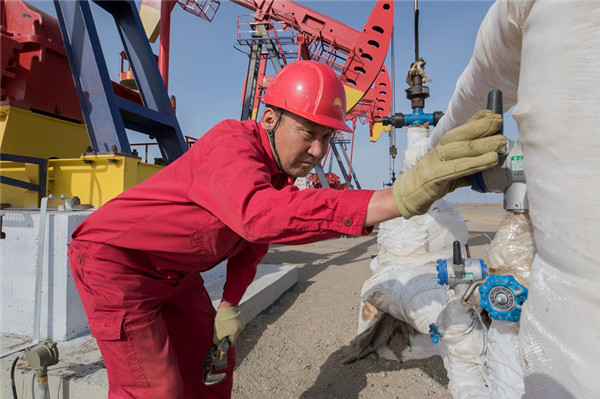 瑪湖油區瑪131井區夏92_H井,員工正觀測大罐浮標,確保拉油量。李丹攝