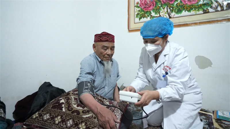 “送醫送藥送物資服務隊”為偏遠牧區牧民群眾檢查身體。周游攝