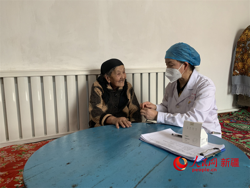 在距離阿熱勒托海牧場40公里外的烏圖布拉格鎮巴亞爾布拉格西村,“送醫送藥送物資服務隊”醫生安永霞帶著“健康包”來到81歲老人艾米娜汗·依明家里,為老人測血壓、血氧、心率,“作為家庭醫生,我們針對60歲以上的人群進行分類管理,每日入戶走訪,進行疾病問診及血氧監測,及時發現異常,做到早發現、早診斷、早治療,以減少危重癥發生?!?/p>