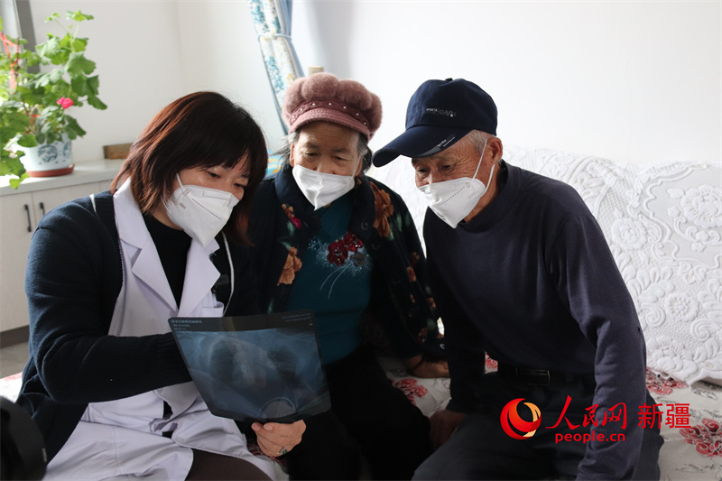 “送醫送藥送物資服務隊”醫生白菊花為老人看胸片。人民網 李欣洋攝