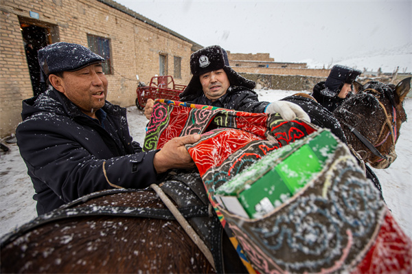 小營盤邊境派出所民警為牧民送去防疫物資。蘆勝磊攝