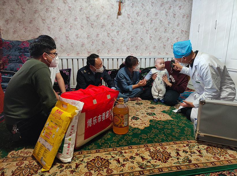 “您好!最近血壓高不高?降壓藥要按時吃上。這是送給您家的‘健康包’,很實用方便!”在新疆博樂市小營盤鎮明格陶勒哈村牧民定居點,小營盤邊境派出所民警與鎮衛生院醫生向牧民送去防疫生活物資,現場為牧民進行健康檢查,細心詢問身體狀況。