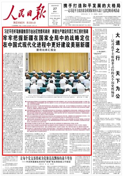 中共中央總書記、國家主席、中央軍委主席習近平在聽取新疆維吾爾自治區黨委和政府、新疆生產建設兵團工作匯報時強調,要完整準確全面貫徹新時代黨的治疆方略,牢牢把握新疆在國家全局中的戰略定位,扭住工作總目標,把依法治疆、團結穩疆、文化潤疆、富民興疆、長期建疆各項工作做深做細做實,穩中求進、綿綿用力、久久為功,在中國式現代化進程中更好建設團結和諧、繁榮富裕、文明進步、安居樂業、生態良好的美麗新疆。
