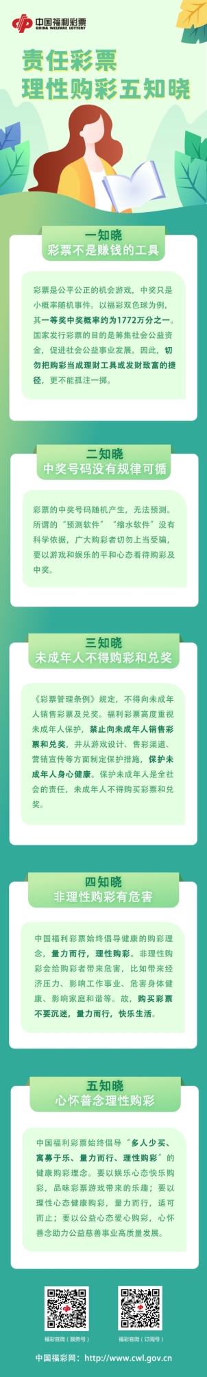 中國福利彩票始終倡導“多人少買、寓募于樂、量力而行、理性購彩”的健康購彩理念。要以娛樂心態快樂購彩,品味彩票游戲帶來的樂趣;要以理性心態健康購彩,量力而行,適可而止;要以公益心態愛心購彩,心懷善念助力公益慈善事業高質量發展。