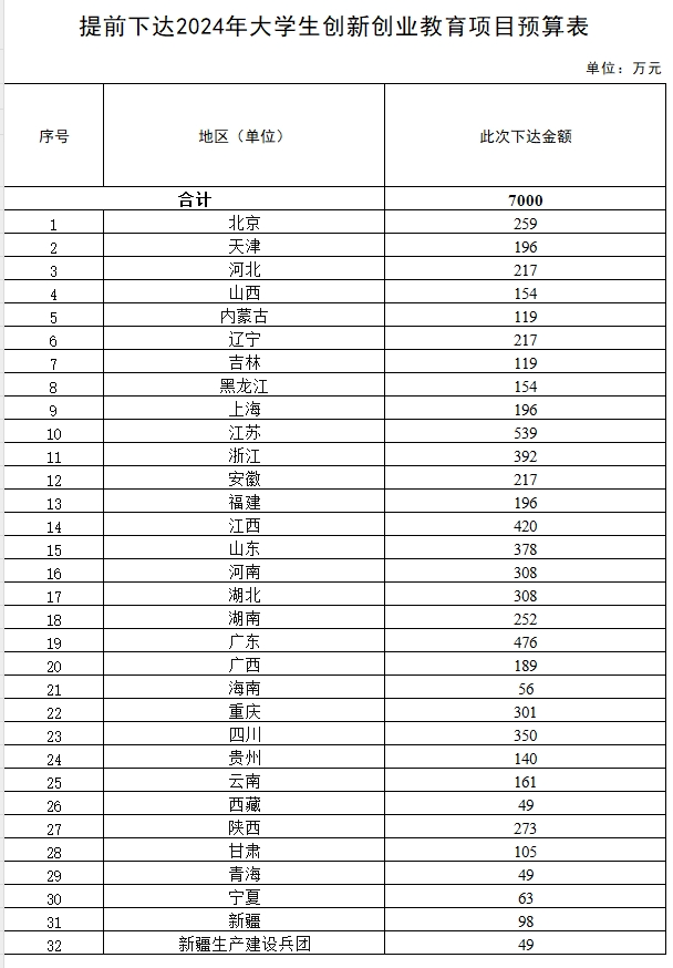 《通知》指出,為提高預算完整性,加快支出進度,支持大學生創新創業教育發展,現提前下達2024年大學生創新創業教育項目預算7000萬元,用于支持各地依托省內高校建設國家級創新創業學院、國家級創新創業教育實踐基地。