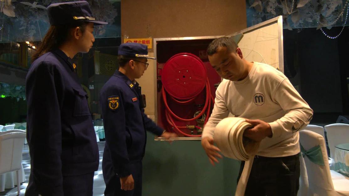 阿克蘇市消防救援大隊消防監督員對宴會廳消防設施進行檢查。汪渝 攝