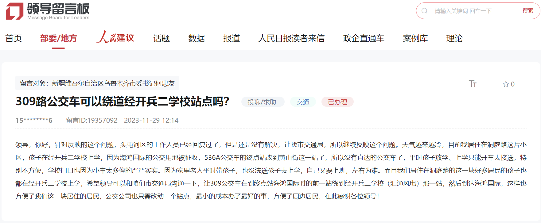 近日,有網友在人民網“領導留言板”向烏魯木齊市委書記反映:因公交站點改變,致使沒有直達學校的公交車,希望公交部門微調309路公交車線路,方便家長接送孩子上下學。