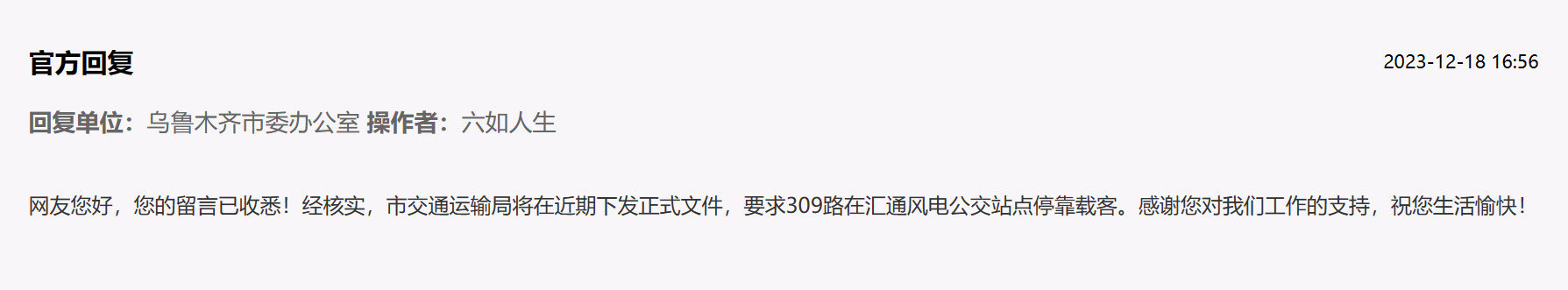 收到該網友留言,烏魯木齊市委辦公室回復:烏魯木齊市交通運輸局將在近期下發正式文件,要求309路在匯通風電公交站點??枯d客。