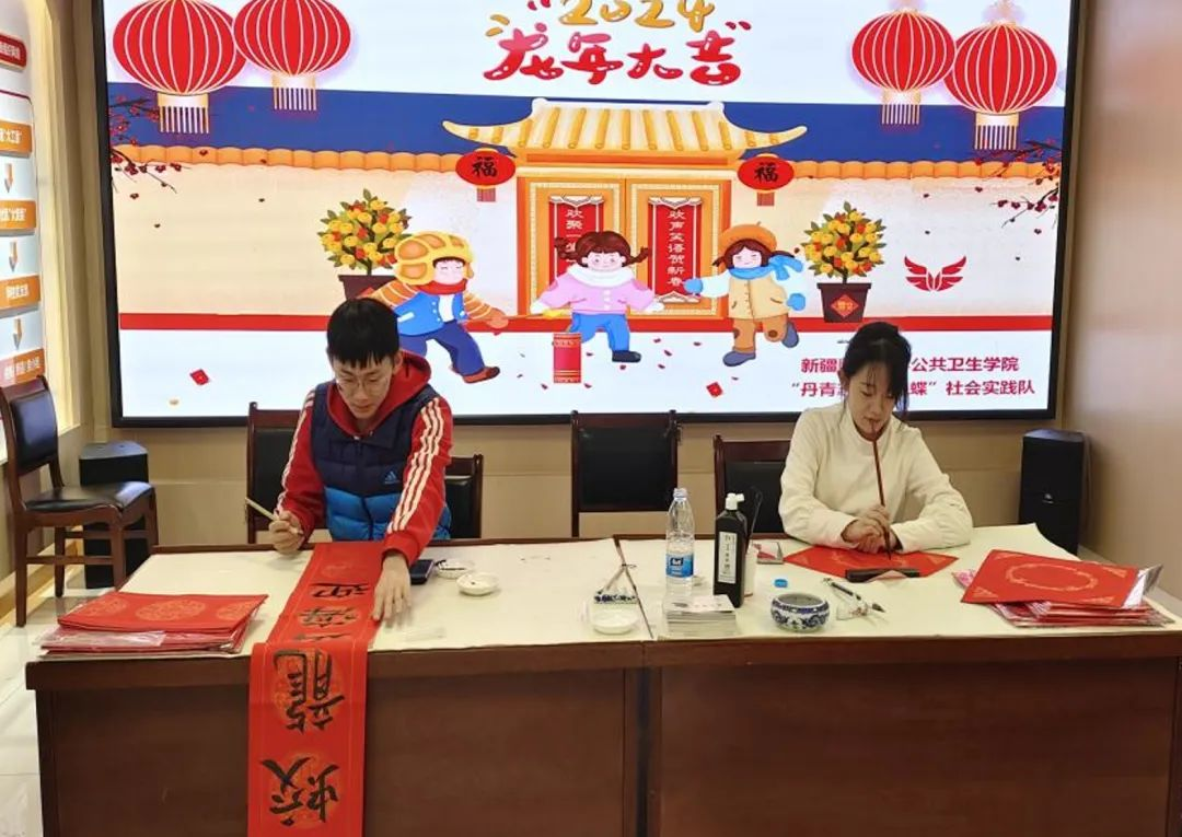近日,七紡街道溫泉北社區新時代文明實踐站聯合新疆醫科大學公共衛生學院“丹青志 紙上蝶”社會實踐隊開展“書墨飄香 喜迎新春”送春聯活動。