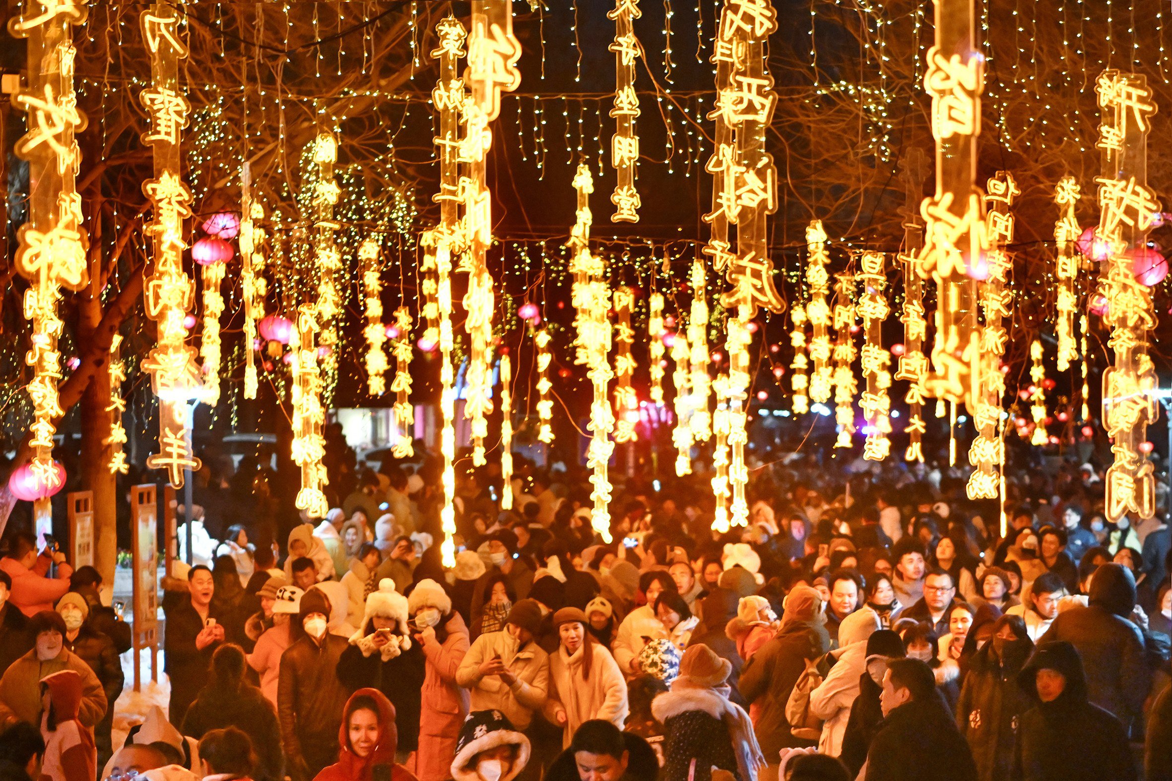 2023年12月31日晚,市民在克拉瑪依區文化步行街鐘樓廣場觀賞“詩詞”燈光秀。閔勇攝