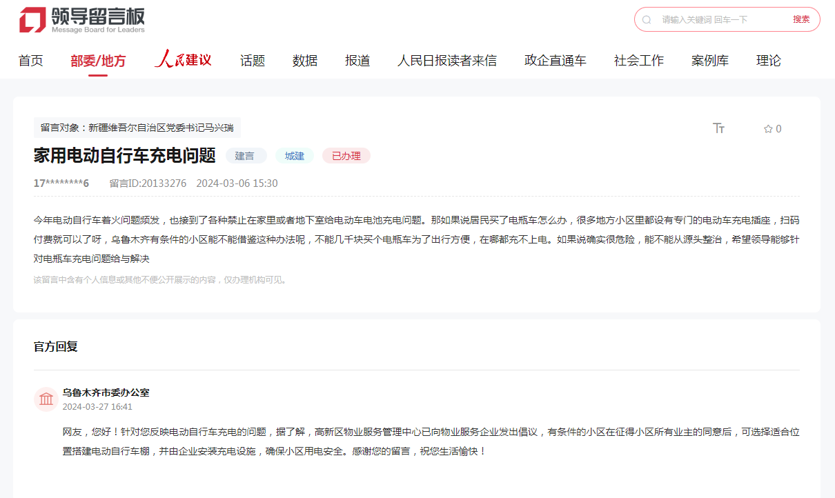 該群眾留言稱,今年電動自行車著火問題頻發,要求禁止在家里或者地下室給電動車電池充電,如果小區無充電樁居民如何給電動車充電?不少小區設有專門的電動車充電插座,掃碼付費就可使用,烏魯木齊有條件的小區能不能借鑒這種辦法,希望能夠有針對性解決電動車充電問題。