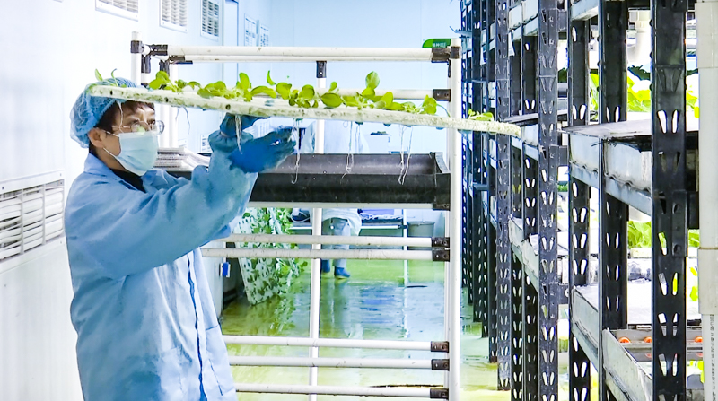 企業相關負責人說,這里是10萬級的無塵車間,已實現溫度、濕度、光照、水、營養液、二氧化碳的全環境自動化控制,蔬菜生產周期不超過40天。