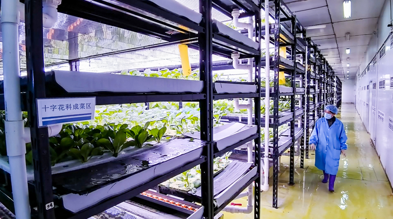 3月的青格達湖鄉,室外還是一片蕭瑟,而在新疆紫晶川梭高新農業股份有限公司智能化LED植物工廠里卻是綠意蔥蔥,5層立體化種植架上,小白菜、葉菜長勢喜人。