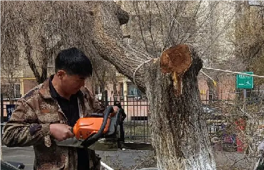 社區工作人員和轄區志愿者首先做好安全防護工作,在斷枝周邊放置警示牌,清理樹下停放車輛,隨后利用電鋸將樹枝和樹杈分層分段鋸開。