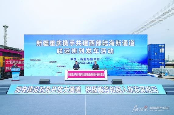 在烏魯木齊國際陸港區,代表團考察了新疆自貿試驗區建設發展、中歐班列集結中心運營等情況,兩地舉行新疆重慶攜手共建西部陸海新通道聯運班列發車活動。袁家軍、馬興瑞共同啟動發車。該班列從新疆經重慶整列發往東南亞國家,通過西部陸海新通道與中歐(中亞)班列聯動發展,進一步打通了中亞、新疆經重慶“南向出?!毙侣窂?。