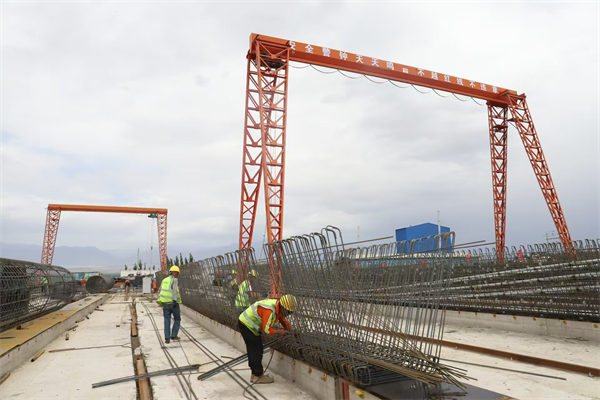 由新疆北新路橋集團股份有限公司承建的該公路項目第三合同段的黃水溝大橋是工程的關鍵一環,在黃水溝大橋梁場內,制梁區、存梁區、養護區、鋼筋加工區和綁扎區等各項生產設施分區而設,工人們正在加班加點生產預制箱梁和樁基鋼筋籠。