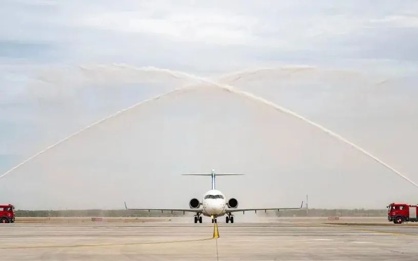 江布拉克機場首航航班落地,消防車噴灑出拱形“水門”,飛機緩緩滑過,接受“水門”洗禮。