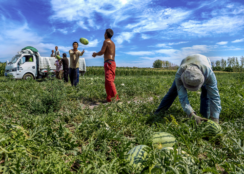 7月27日,種植戶帶領采摘工采收安農2號西瓜。